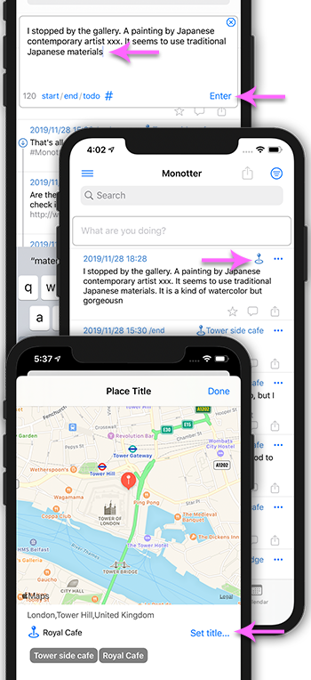 ・テキスト入力域にテキストを入力し、「Enter」ボタンをタップ。 ・タイムラインにテキストが追加されます。場所に名前を付けたい場合は、Placeボタン(ピンのアイコン)をタップ。 ・表示された場所名のダイアログで「設定する...」ボタンをタップ→場所に名前をつける。 ※場所に名前を付けておくと、以降、同じ場所でのエントリーに自動的にその場所名が付きます。