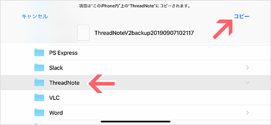 5)「ThradNote」を選択して、右上の「コピー」ボタンをタップ。これで、ファイルはThreadNoteの「バックアップ/リストア」における「リストア」の一覧に追加されます。